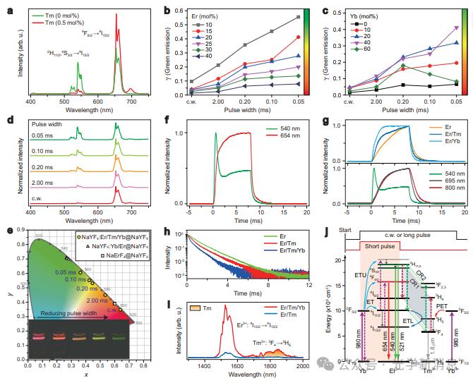 圖2. Er/Tm/Yb三摻雜納米顆粒中的紅/綠顏色可切換上轉(zhuǎn)換