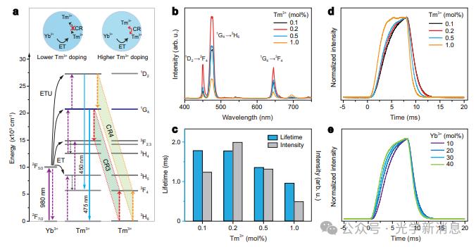 圖3. 調(diào)控Tm³?藍(lán)色上轉(zhuǎn)換的上升和衰減時間 a Yb/Tm耦合體系中Tm³?藍(lán)色上轉(zhuǎn)換示意圖以及可能導(dǎo)致發(fā)射猝滅的交叉弛豫(CR)過程。CR3和CR4分別代表[¹G?;³H?]→[³F?;³F?]和[¹D?;³H?]→[¹G?;³F?]的交叉弛豫過程。插圖對比了低、高Tm³?摻雜情況下有、無交叉弛豫時的離子相互作用。 b 980nm激發(fā)下,NaYF?:Yb/Tm(20/0.1 - 1.0 mol%)@NaYF?核殼納米顆粒的上轉(zhuǎn)換發(fā)射光譜。 c (b)中樣品在475nm處的發(fā)射強度和壽命隨Tm³?摻雜濃度的變化關(guān)系。 d、e (b)中樣品以及NaYF?:Yb/Tm(10 - 40/0.1 mol%)@NaYF?核殼納米顆粒在脈沖寬度為8ms的980nm脈沖激發(fā)下,Tm³?在475nm處的時間相關(guān)上轉(zhuǎn)換發(fā)射譜。