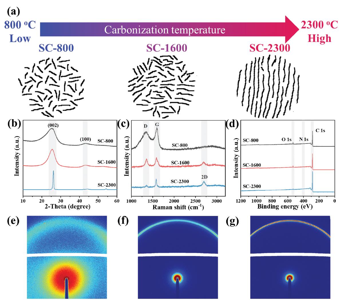 圖1:不同溫度下制備的碳材料的微觀結(jié)構(gòu)示意圖。a) 碳材料微觀結(jié)構(gòu)的示意圖。b) X射線衍射(XRD)圖譜。c) 拉曼圖譜。d) X射線光電子能譜(XPS)圖譜。e) SC-800的2D廣角X射線散射(WAXS)圖譜。f) SC-1600的2D WAXS圖譜。g) SC-2300的2D WAXS圖譜。