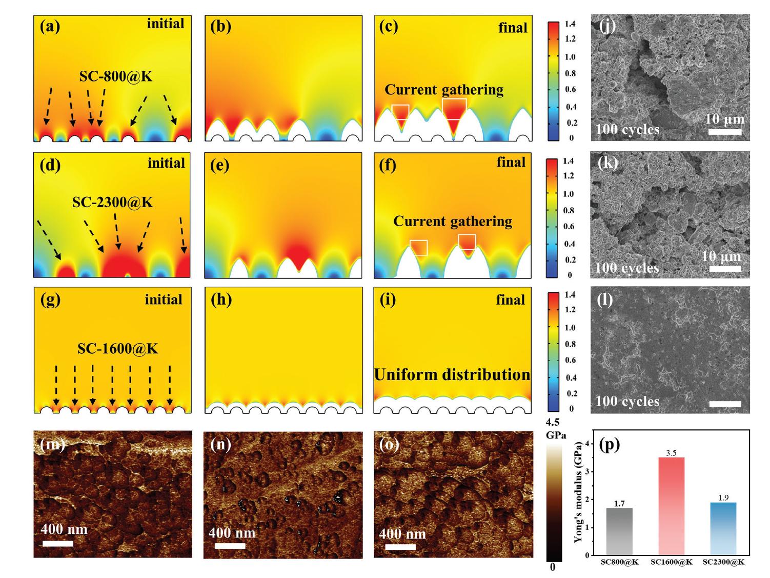 圖2:COMSOL多物理場模擬的2D電流密度分布。a-c) SC-800@K,d-f) SC-2300@K,g-i) SC-1600@K。j) SC-800@K,k) SC-2300@K,l) SC-1600@K復(fù)合陽極在0.5 mA cm-2電流密度下經(jīng)過100個循環(huán)后的表面形貌。m) SC-800@K,n) SC-1600@K,o) SC-2300@K在0.5 mA cm-2電流密度下經(jīng)過5個循環(huán)后的SEI層楊氏模量的分布。p) 對應(yīng)的楊氏模量值。