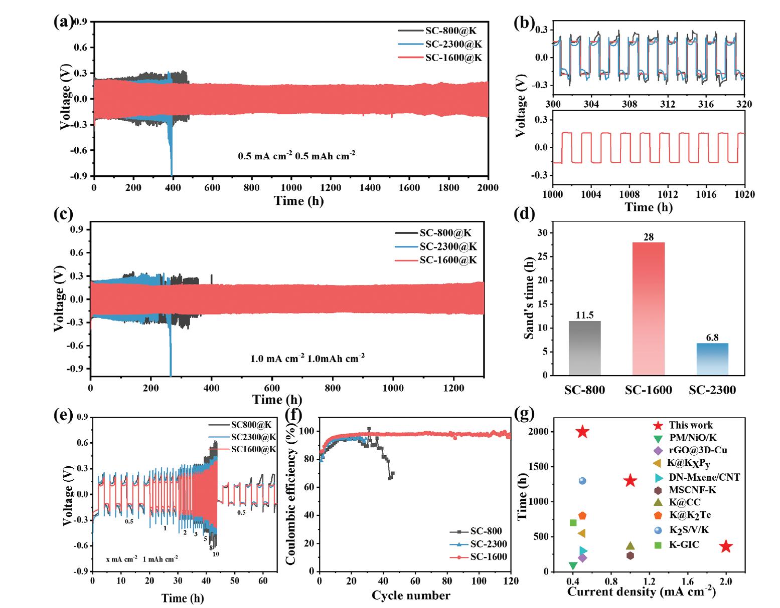 圖3:復(fù)合電極的電化學(xué)性能。a) SC-X@K在對稱電池中的循環(huán)穩(wěn)定性,在0.5 mA cm-2電流密度下,容量為0.5 mAh cm-2。b) a)中約300和1000小時的放大曲線。c) SC-X@K在對稱電池中的循環(huán)穩(wěn)定性,在1 mA cm-2電流密度下,固定容量為1 mAh cm-2。d) 不同復(fù)合陽極的Sand's時間值。e) SC-X@K在0.5至10 mA cm-2的固定容量1 mAh cm-2下的倍率性能。f) 在0.5 mA cm-2和0.5 mAh cm-2下,SC-X電極上鉀鍍/剝離的庫侖效率。g) SC-1600@K復(fù)合陽極與其他報道的鉀陽極的電化學(xué)性能比較。