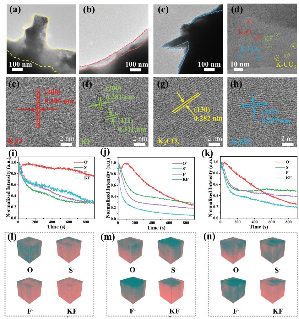 圖4:SC-800@K,SC-1600@K和SC-2300@K表面的Cryo-TEM圖像。a) SC-800@K,b) SC-1600@K,c) SC-2300@K以及SC-1600@K的SEI層的相組成d-h。ToF-SIMS深度剖析和O−,S−,F(xiàn)−和KF−在i,l) SC-800@K,j,m) SC-1600@K,k,n) SC-2300@K表面的分布,這些是在0.5 mA cm-2電流密度下,容量為0.5 mAh cm-2經(jīng)過5個循環(huán)后的圖像(在l-n中,青色區(qū)域代表單個片段離子,而粉色區(qū)域代表背景)。