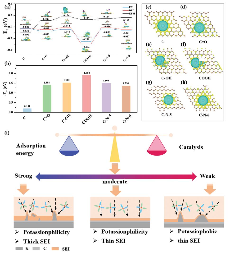 圖5:a) EC,DEC和KFSI在不同碳構(gòu)型表面上的結(jié)合能。b) K離子在不同碳構(gòu)型表面上的吸附能,以及c-h)相應(yīng)的差分電荷密度。i) 吸附能和催化能力對K沉積和SEI形成的影響。
