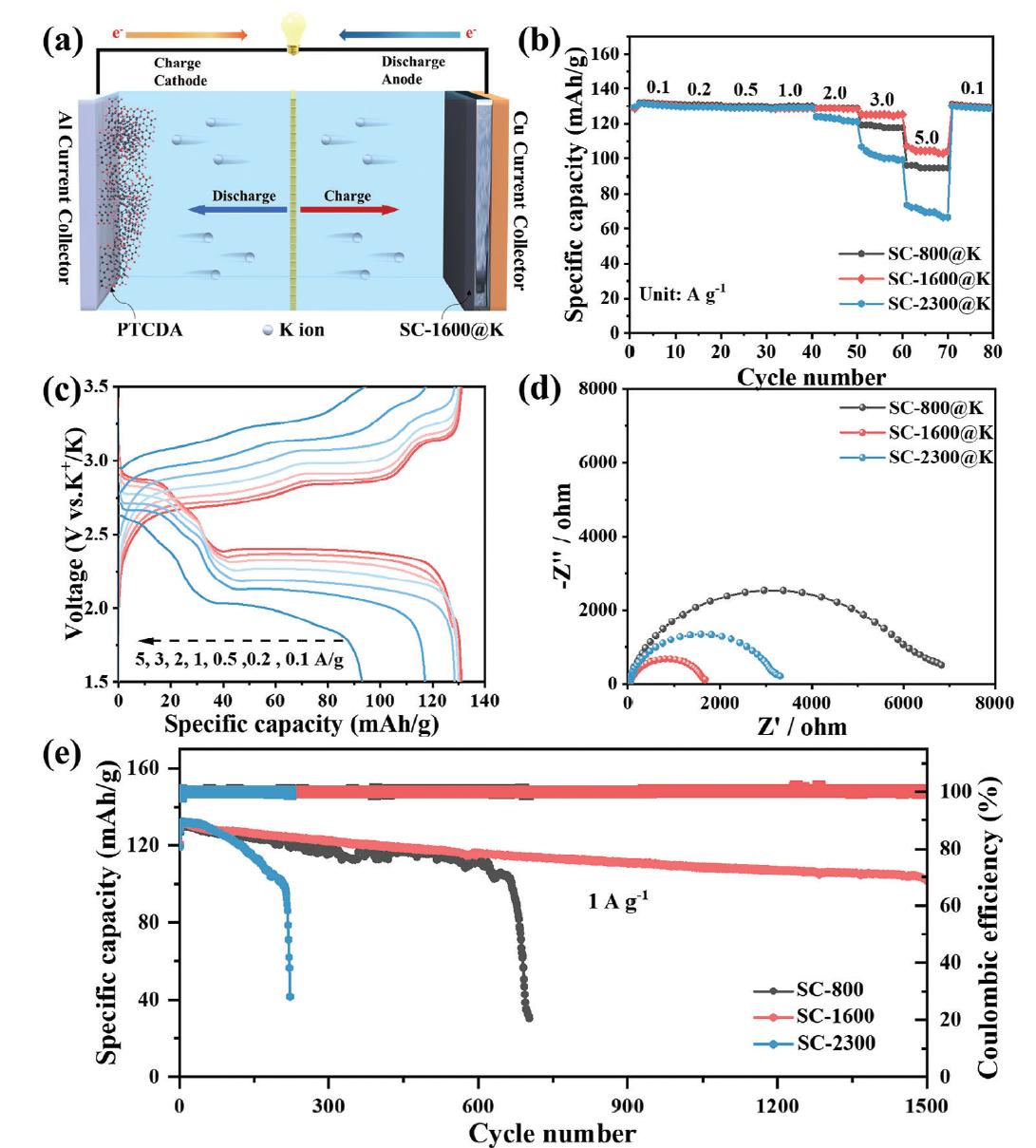 圖6:PTCDA//SC-X@K的電化學(xué)性能。a) PTCDA//SC-1600@K電池的示意圖。b) 全電池的倍率性能。c) 不同電流密度下PTCDA//SC-1600@K全電池的充放電曲線。d) 10個循環(huán)后全電池的電化學(xué)阻抗譜。e) 在1 A g-1電流密度下的循環(huán)穩(wěn)定性。