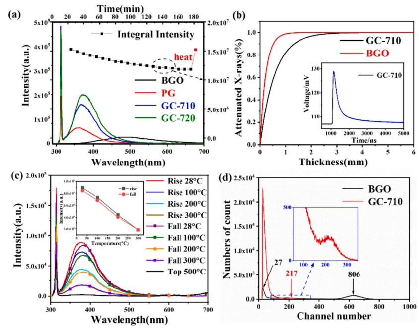 圖 3. 納米玻璃閃爍體的閃爍特性。(a)樣品與 BGO 的 X 射線激發(fā)發(fā)光(XEL)光譜,虛線顯示積分 XEL 強(qiáng)度隨輻照時(shí)間(長達(dá) 176 分鐘)的變化;(b)計(jì)算得到的 GC-710 與 BGO 在 50 keV X 射線下的衰減效率隨樣品厚度的變化,插圖為 GC-710 的放射發(fā)光(RL)衰減曲線及雙指數(shù)擬合(藍(lán)色曲線);(c)GC 在 28–500℃升 - 降溫循環(huán)中的 XEL 光譜,插圖為升 - 降溫過程中 XEL 強(qiáng)度的變化;(d)GC-710 與 BGO 的 137Cs γ 射線脈沖高度譜,插圖為 GC-710 的局部放大圖。