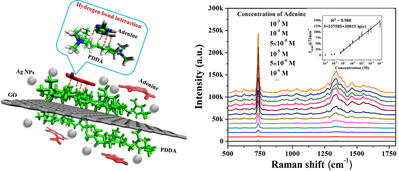 3、利用氫鍵在樣品富集和選擇性檢測中具有獨(dú)特的優(yōu)勢,采用自組裝法制備氧化石墨烯/聚二烯丙基二甲基氯化銨/銀納米粒子(GO/PDDA/Ag NPs)納米復(fù)合材料作為SERS基底,具備良好的穩(wěn)定性和SERS檢測的可轉(zhuǎn)移性;實(shí)現(xiàn)定量檢測水溶液中腺嘌呤含量,并對其他結(jié)構(gòu)相似的核酸堿基如鳥嘌呤、胞嘧啶、胸腺嘧啶具有良好的抗干擾能力。應(yīng)用DFT計(jì)算分析了PDDA與腺嘌呤間氫鍵作用的不同結(jié)合方式及其鍵能大小,為氫鍵的選擇性富集作用提供支撐。該研究工作發(fā)表于Talanta 2019, 204, 372-378。