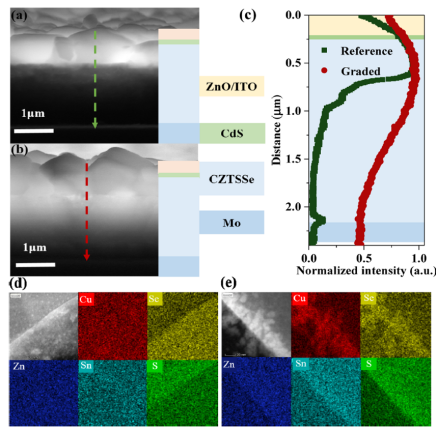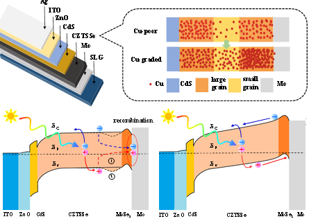 河南大學(xué)武四新教授課題組基于貧銅組分在前界面以及富銅組分在背界面的優(yōu)勢(shì),設(shè)計(jì)了一種三層(大晶粒/小晶粒/大晶粒)的銅梯度吸收層結(jié)構(gòu),底部銅含量較高而表面銅含量較低。較高的銅濃度可以增加載流子濃度,通過(guò)構(gòu)筑載流子濃度梯度改善電荷傳輸驅(qū)動(dòng)力。同時(shí),高銅組分可以使吸收層價(jià)帶上移,降低空穴的注入勢(shì)壘,從而降低背界面復(fù)合。頂部的貧銅結(jié)構(gòu)減緩了表面的費(fèi)米能級(jí)釘扎并有利于界面能帶彎曲的保持。銅梯度吸收層優(yōu)良的電學(xué)性能使器件效率達(dá)到12.54%,對(duì)于后續(xù)銅鋅錫硫硒薄膜太陽(yáng)能電池的界面性能改善及吸收層結(jié)構(gòu)優(yōu)化具有重要的意義。