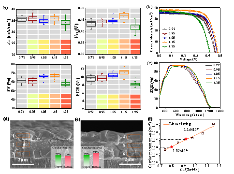 圖2 不同Cu濃度CZTSSe電池PV性能參數(shù)統(tǒng)計(jì)圖、J-V曲線、EQE曲線、掃描電鏡圖和載流子濃度比值