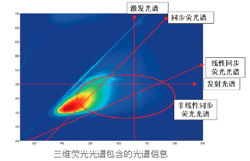 三維熒光光譜包含的光譜信息如右圖所示,分別為激發(fā)光譜、發(fā)射光譜、同步熒光光譜、線性同步熒光光譜、非線性同步熒光光譜。不難看出,一幅三維熒光光譜包含了我們現(xiàn)在所研究的大部分的熒光光譜信息( 激發(fā)光譜、發(fā)射光譜和同步熒光光譜) 以及我們?cè)诙S熒光光譜上無法觀測(cè)的光譜信息( 線性同步熒光光譜和非線性同步熒光光譜)。