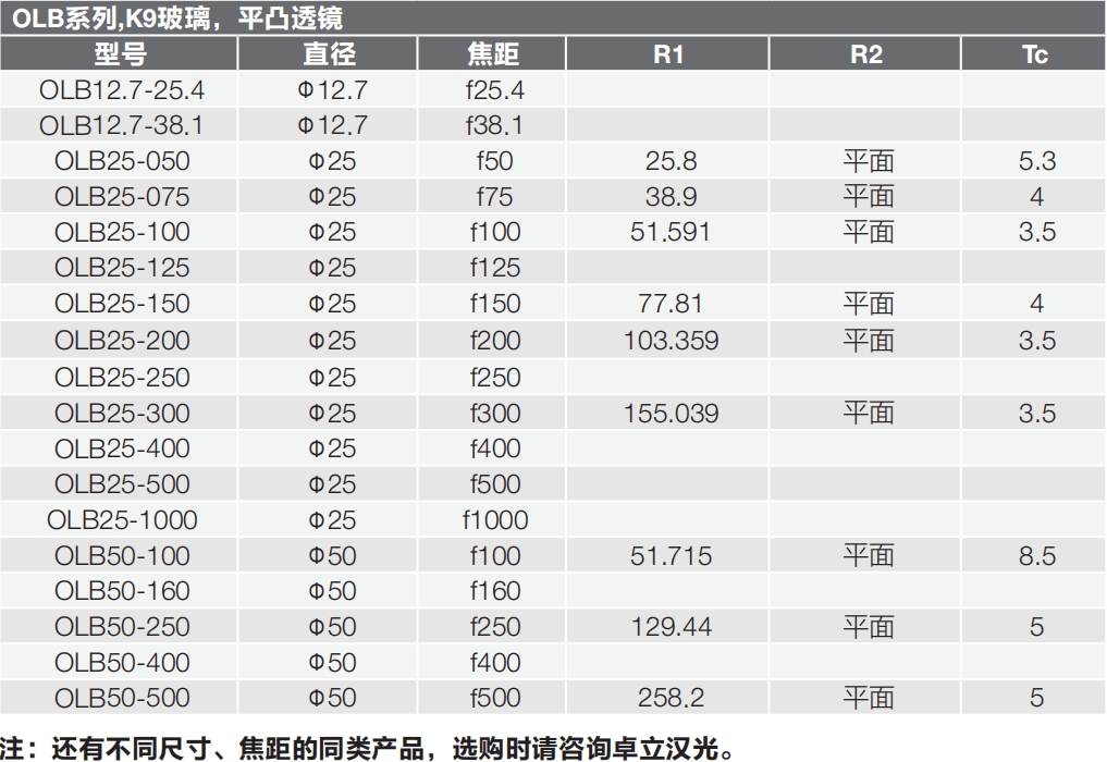 OBL系列平凸透鏡選型表: