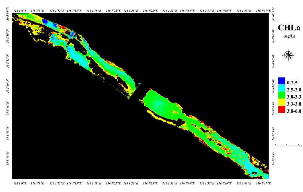 Taking the Daqing River as an example, the airborne hyperspectral imagery was used to invert the distribution of chlorophyll a concentration in the water quality of the Daqing River, as showed in Figure 5.