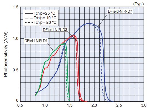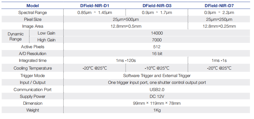 DField-NIR series InGaAs linear array detector features large dynamic range, low noise, wide spectral range, and has a wide application space. Its wavelength coverage range can reach 850nm~2200nm.