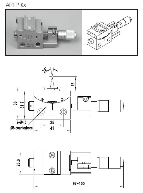 APFP-θx光纖專(zhuān)用擺動(dòng)滑臺(tái)可與APFP-XYZ 組合使用,提供繞X 軸的傾斜調(diào)整。配有燕尾座,可固定光學(xué)器件安裝座。