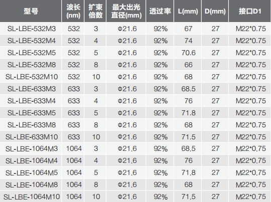 LBE系列激光擴(kuò)束鏡選型表: