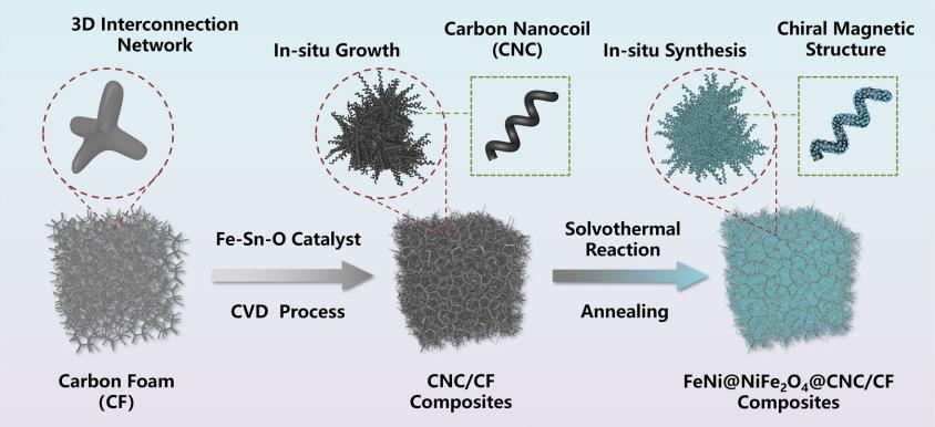 構(gòu)建基于碳納米線圈(CNC)的手性-介電-磁三位一體復(fù)合材料被認(rèn)為是實現(xiàn)優(yōu)異低頻微波吸收的一種有前途的方法。然而,進一步增強低頻微波吸收和闡明相關(guān)損耗機制仍然是一個挑戰(zhàn)。近日,大連理工大學(xué)物理學(xué)院潘路軍教授團隊在《Nano-Micro Letters》期刊發(fā)表題為《Multifunctional Carbon Foam with Nanoscale Chiral Magnetic Heterostructures for Broadband Microwave Absorption in Low Frequency》的研究論文。為實現(xiàn)寬帶微波吸收的手性-介電-磁三位一體復(fù)合材料的微觀結(jié)構(gòu)設(shè)計提供了進一步的指導(dǎo)。