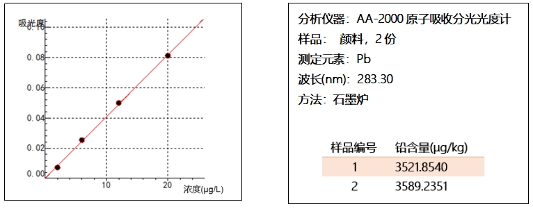 食品添加劑是指為改善食品品質(zhì)和色、香、味,以及為防腐、保鮮和加工工藝的需要而加入食品中的人工合成或者天然物質(zhì)。食品用香料、膠基糖果中基礎(chǔ)劑物質(zhì)、食品工業(yè)用加工助劑、營養(yǎng)強化劑也包括在內(nèi)?!妒称钒踩珖覙?biāo)準(zhǔn) 食品添加劑使用標(biāo)準(zhǔn)》(GB 2760-2024)中對食品添加劑*基本的要求是不應(yīng)對人體產(chǎn)生任何健康危害。此次天水幼兒園血鉛事件中違規(guī)使用顏料作為食品添加劑,那么在一般的顏料中鉛含量究竟是什么水平呢?圖1為卓立漢光AA-2000原子吸收分光光度計測定顏料鉛含量的示例,兩份樣品測出來的Pb含量高達(dá)3521.8540μg/kg和3589.2351 μg/kg??梢婎伭鲜墙^對禁止作為食品添加劑使用的。