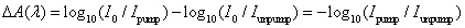 瞬態(tài)吸收測(cè)試的是材料被激發(fā)后吸收相對(duì)于穩(wěn)態(tài)的瞬時(shí)變化。根據(jù)比爾-朗伯(Beer-Lambert)定律,一束光穿過(guò)均勻吸收介質(zhì)會(huì)發(fā)生強(qiáng)度的衰減。以溶液樣品為例,對(duì)于波長(zhǎng)為λ的光,忽略散射作用,其透過(guò)樣品的光強(qiáng)正比于光程L,液體樣品的濃度c,以及其摩爾吸收系數(shù)e,其吸收度(Absorbance)表達(dá)為: