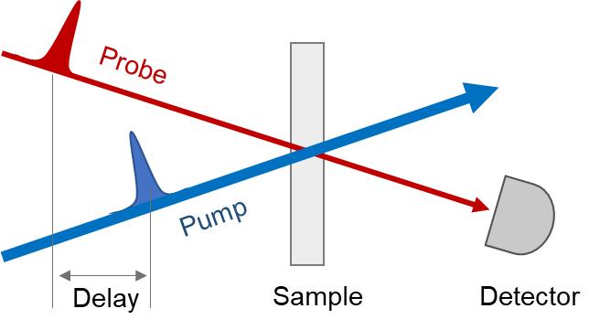 類(lèi)似于大部分超快光譜技術(shù),通常意義上的瞬態(tài)吸收是基于泵浦-探測(cè)(Pump-Probe)機(jī)制構(gòu)建的技術(shù),如圖1所示。其中泵浦光為一束強(qiáng)脈沖激光,用于激發(fā)被測(cè)試材料;探測(cè)光為一束較弱的脈沖激光(通常功率密度小于泵浦光兩個(gè)量級(jí)以上),用于探測(cè)材料被泵浦光瞬時(shí)激發(fā)之后的吸收度的變化。瞬態(tài)吸收光譜信號(hào)由有泵浦光與無(wú)泵浦光激發(fā)時(shí)探測(cè)光透過(guò)材料的吸收度相減獲得,即: