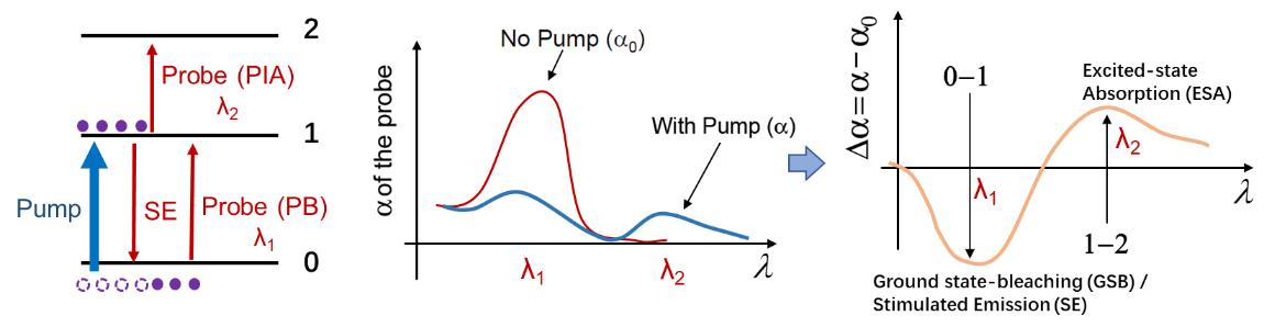 圖2、飛秒瞬態(tài)吸收的主要過(guò)程和光譜特征。