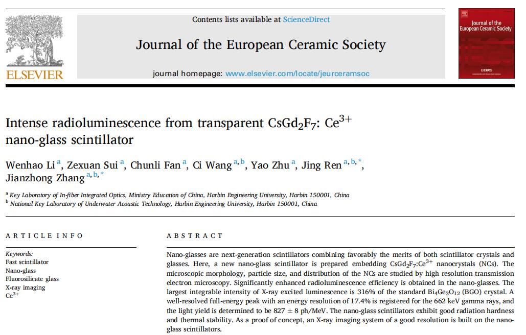 哈爾濱工程大學(xué)物理與光電工程學(xué)院任晶教授團(tuán)隊(duì)在X射線成像領(lǐng)域取得重要進(jìn)展。研究成果以“Intense radioluminescence from transparent CsGd2F7: Ce3+ nano-glass scintillator”為題發(fā)表在國(guó)際知名期刊《Journal of the European Ceramic Society》上。哈爾濱工程大學(xué)為該論文第一單位,任晶教授/張建中教授為共同通訊作者。今天小卓為大家分享該研究成果,希望對(duì)您的科學(xué)研究或工業(yè)應(yīng)用帶來(lái)一些靈感和啟發(fā)。