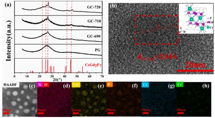 圖1. 納米玻璃閃爍體的納米級(jí)表征:(a)樣品與 CsGd?F?晶體的 XRD 圖譜(PDF#27–0112,紅線);(b)GC-710 的高分辨透射電鏡(HRTEM)圖像,插圖為 CsGd?F?晶體結(jié)構(gòu)示意圖;(c)GC-710 的暗場(chǎng)透射電鏡(TEM)圖像,以及對(duì)應(yīng)的(d)Si、(e)Gd、(f)F(g)Cs、(h)Ce 元素映射圖,元素濃度通過(guò)顏色亮度反映。