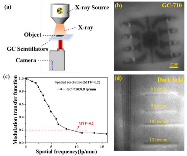 圖 4. 基于納米玻璃閃爍體的 X 射線成像演示(a)X 射線成像系統(tǒng)示意圖;(b)微芯片的 X 射線圖像(劑量率:30 mGy air/s,電壓:60 kV);(c)調(diào)制傳遞函數(shù)(MTF)隨空間頻率(lp/mm)的變化曲線,空間分辨率(MTF=0.2 時(shí))為 8.8 lp/mm;(d)標(biāo)準(zhǔn) X 射線分辨率測(cè)試模板的明場(chǎng)圖像(劑量率:30 mGy air/s,電壓:60 kV)。