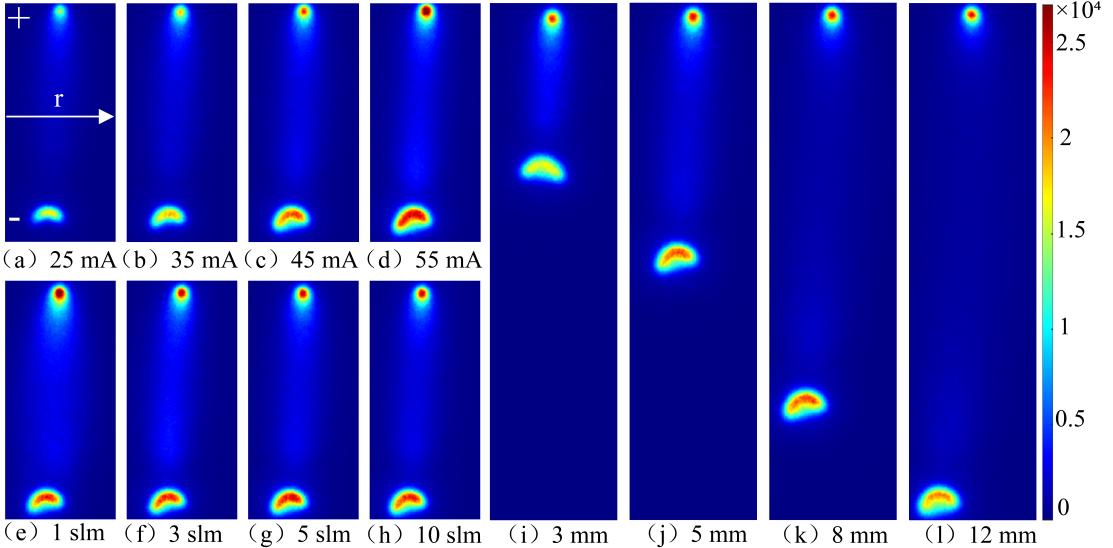 氣體流量的影響(圖1 e-h):在固定電流(45 mA)和間距(5 mm)下,氣流從1 slm增至10 slm。氣流對陽極和陰極區(qū)的等離子體形態(tài)影響明顯,尤其是在陽極附近,隨著流速增加,等離子體直徑更窄,這種現(xiàn)象可以歸因于增強的對流冷卻效應。較高的氣體流量能夠更有效地帶走放電通道邊緣的熱量,抑制其徑向擴展,從而導致放電通道的收縮。