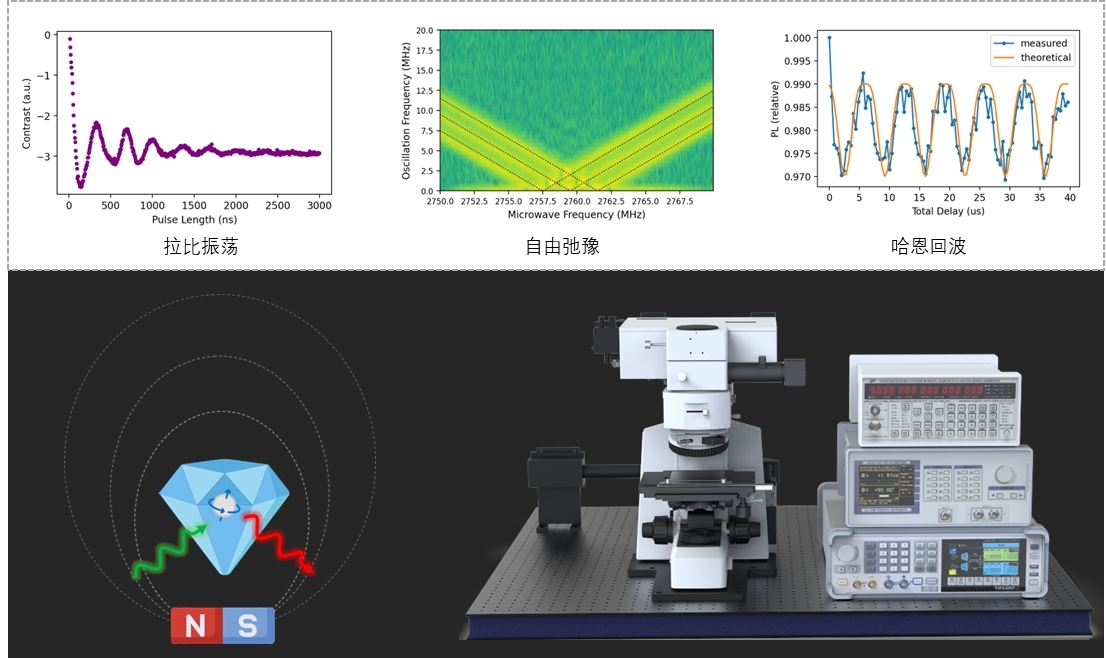 北京卓立漢光儀器有限公司推出的基于NV色心的Finder-NV光探測(cè)磁共振(ODMR)測(cè)試系統(tǒng)可在CW-ODMR和Pulsed-ODMR之間切換。在CW-ODMR模式下,可測(cè)試NV色心在磁場(chǎng)下的塞曼分裂,實(shí)現(xiàn)高空間分辨率下高靈敏度探測(cè)弱磁場(chǎng)信號(hào);而縱向零場(chǎng)劈裂的大小受溫度變化影響極大,NV色心可作為溫度傳感器感應(yīng)溫度變化。在Pulsed-ODMR模式中,通過(guò)對(duì)電子自旋施加動(dòng)力學(xué)解耦脈沖序列(Dynamical Decoupling)進(jìn)行量子操控,可測(cè)試NV色心中的拉比振蕩(Rabi Oscillations),哈恩回波(Spin Echo),自由弛豫衰減(Free Precession)等過(guò)程。