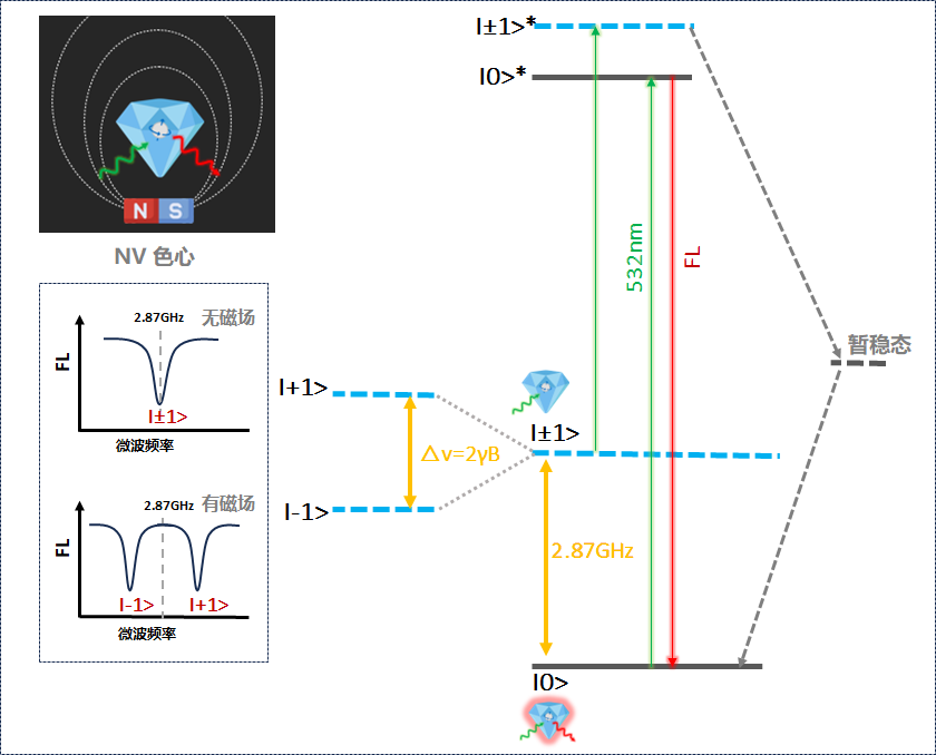 NV色心中的電子有三種自旋狀態(tài),可以用符號(hào)表示為|0〉、|+1〉和|-1〉。我們可以將其簡(jiǎn)單理解為這是電子旋轉(zhuǎn)的三種“姿態(tài)”,對(duì)應(yīng)三個(gè)能級(jí),或者稱為三個(gè)量子態(tài)。當(dāng)用一束特定波長(zhǎng)的綠光去照射NV色心的時(shí)候,能把色心中的電子全部初始化到|0〉態(tài)。在|0〉態(tài),NV色心會(huì)以輻射發(fā)光的方式釋放激發(fā)態(tài)能量,發(fā)出紅色熒光,NV色心處于亮態(tài)。如果此時(shí)對(duì)NV色心施加微波場(chǎng),當(dāng)微波頻率與 NV電子自旋躍遷能級(jí)差相等時(shí),就會(huì)發(fā)生共振,NV色心便從|0〉 態(tài)躍遷到|+1〉和|-1〉態(tài),這時(shí)處于激發(fā)態(tài)的電子要經(jīng)過(guò)系間竄越過(guò)程,先到達(dá)暫穩(wěn)態(tài)后退激返回基態(tài),此過(guò)程不會(huì)輻射發(fā)光,因此會(huì)檢測(cè)到熒光計(jì)數(shù)下降,NV色心處于暗態(tài)。由于NV色心熒光具有自旋依賴性,我們可以用激光來(lái)探測(cè)NV色心電子順磁共振信號(hào),該方法也被稱為光探測(cè)磁共振(Optically Detected Magnetic Resonance,ODMR)